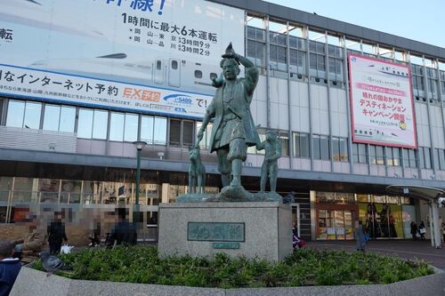 岡山駅前の目の前には後楽園・岡山城方面へ向かう大通りがのびています。この通りの名前は「桃太郎大通り」。この大通りの歩道では、犬、雉、猿が待っています。ぜひ、きびだんごを持って出かけましょう(笑)